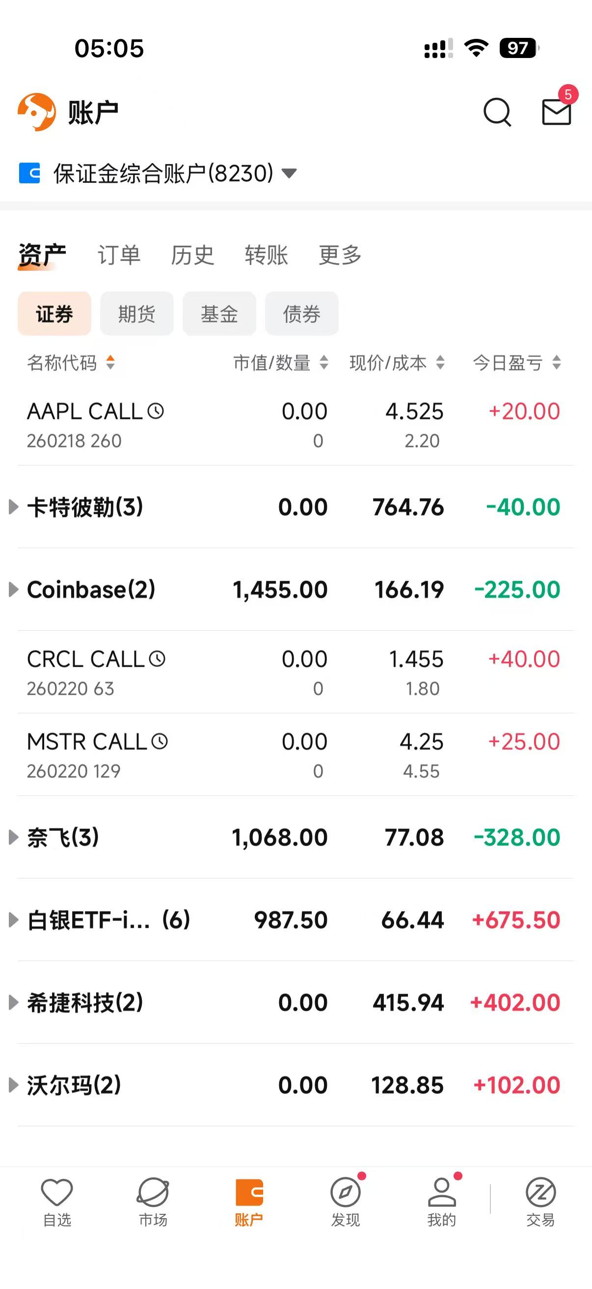 今天实在有点操蛋,买了slv的末日,竟然没留意是今晚到期的,想留着买的价格这么便宜留到明天再看,反正是双买的,从而在大幅度盈利的情况下没有出掉,本来盈利将近2000美金了,还给老婆炫耀了下,结果收盘只667美金利润。不过手头还有4张coin的call,5张slv call,6张put,4张COIN的call讲道理不能过夜,明天有可能导致亏损,不过就这样吧,毕竟今天还是有利润的。slv尽然每周有三个末日期权,日了狗,难怪这么便宜